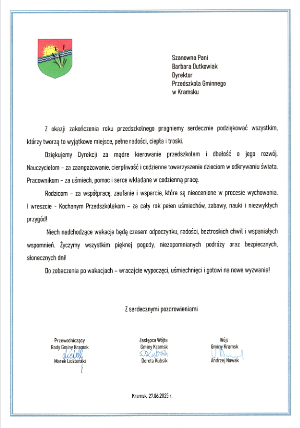 Zakończenie roku 2024/2025 list od Władz Gminy Kramsk