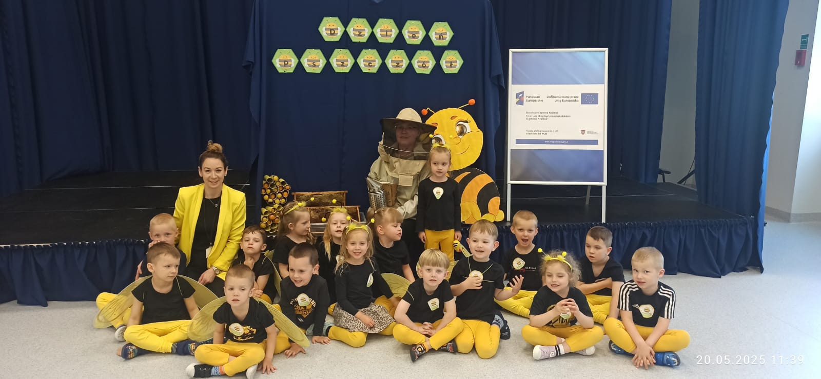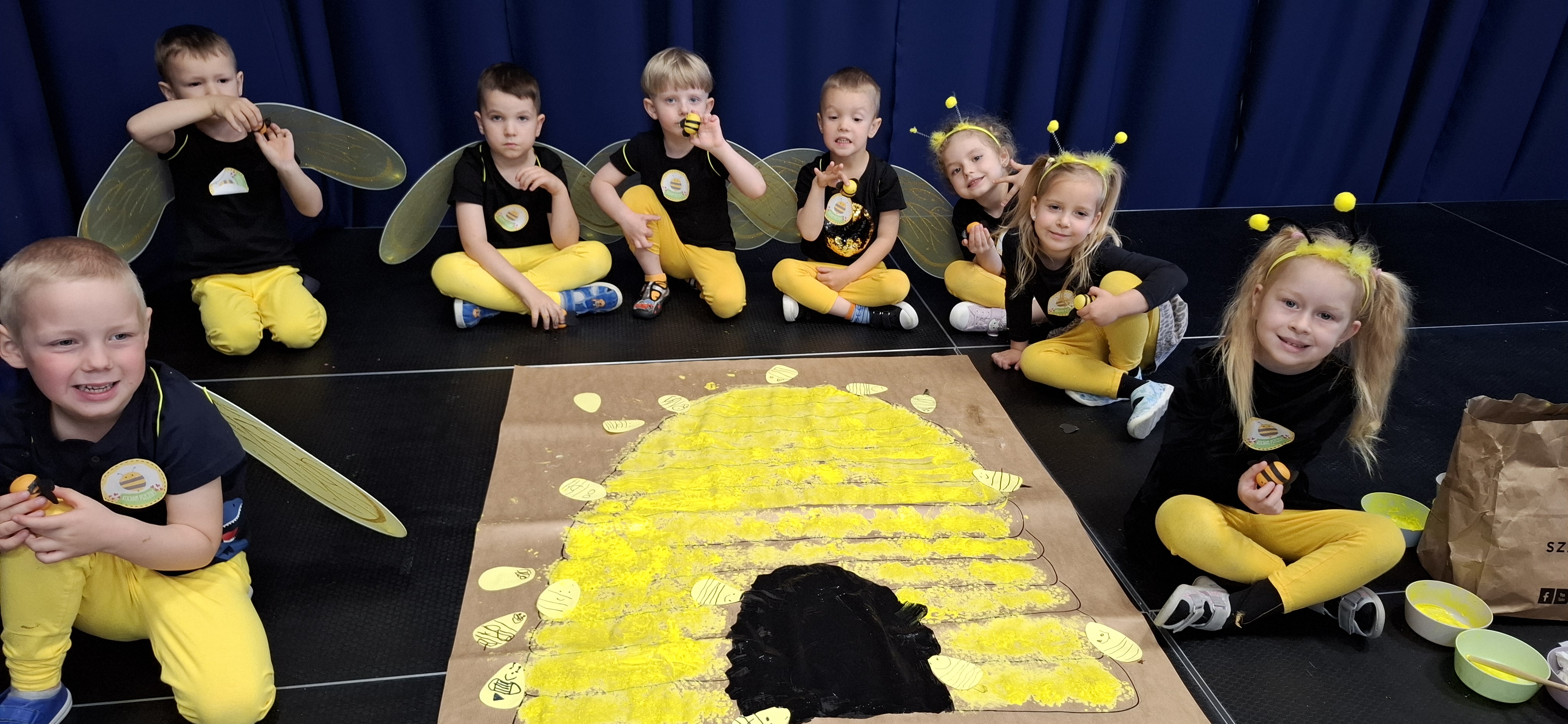 Przedszkolaki wspólnie z grupą IV obchodziły „Światowy Dzień Pszczół”. Dzięki tym zajęciom u dzieci rozbudzono świadomości na temat życia pszczół oraz ich pożyteczności. Dzień ten był pełen atrakcji, dzieci brały udział m.in. w zabawach ruchowych pokonując tor przeszkód, zbierały pszczółki oraz wykonywały prace plastyczną w grupach. O tym jak ważną role odgrywają pszczoły oraz jak powstaje miód w bardzo ciekawy sposób opowiedziala Pani Iza z grupy 3 pokazując narzędzia, którymi na co dzień posługują się hodowcy pszczół, przedszkolaki miały okazję przymierzyć strój pszczelarza, przekonać się do czego służą ramki w ulu oraz poczuć zapach pszczelego wosku. Nie mogło zabraknąć degustacji pysznego miodu prosto z plastra.