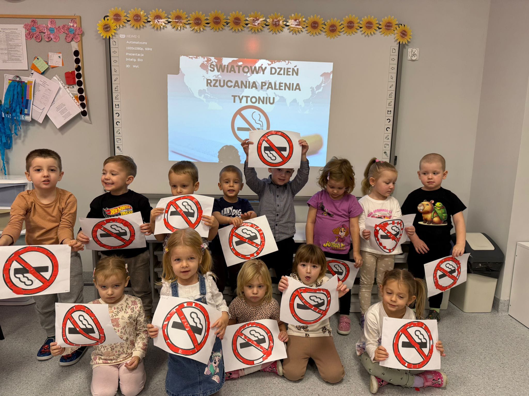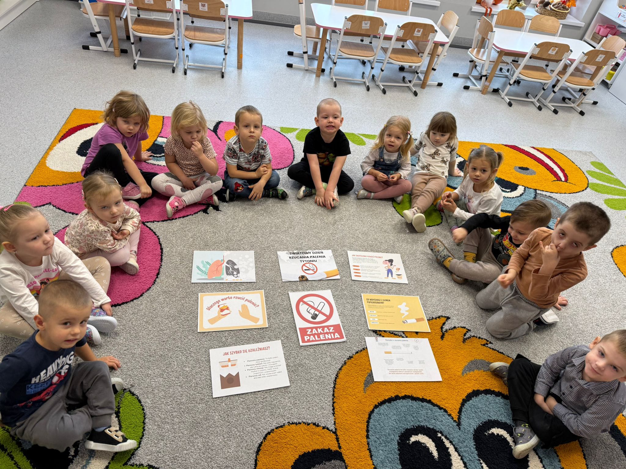 Z okazji Światowego Dnia Rzucania Palenia 21 listopada przedszkolaki wykonały wspólnie plakat pod hasłem „Rzuć Palenie Razem z Nami”, wszystkie dzieci z dużym zaangażowaniem wyklejały serce i ozdabiały plakat, który z pewnością pokazuje jak szkodliwe jest palenie papierosów i wdychanie dymu nikotynowego. Dzieci brały aktywny udział w pogadance dotyczącej naszego zdrowia i niebezpiecznych skutków czynnego i biernego palenia papierosów.