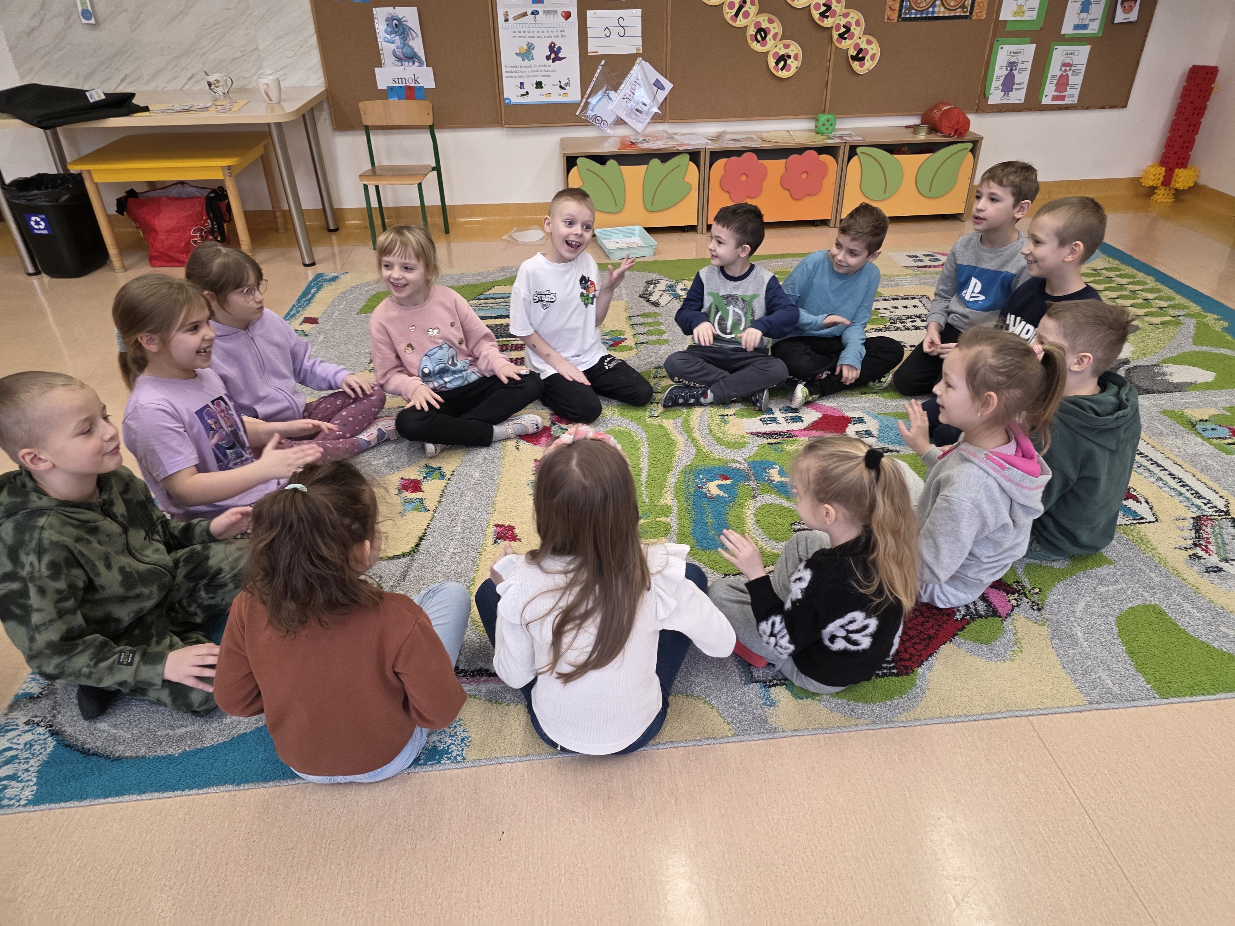 ,,Każdy z nas 5 zmysłów ma! Masz je Ty, mam i Ja! Dwoje oczu mam- Patrzę nimi tu i tam. Dwoje uszu mam- Wszystko dobrze słyszę sam. Nos mi służy do wąchania, Dłonie zaś do dotykania. Język jest do smakowania, Różnych potraw próbowania.” Gabriela Lipińska