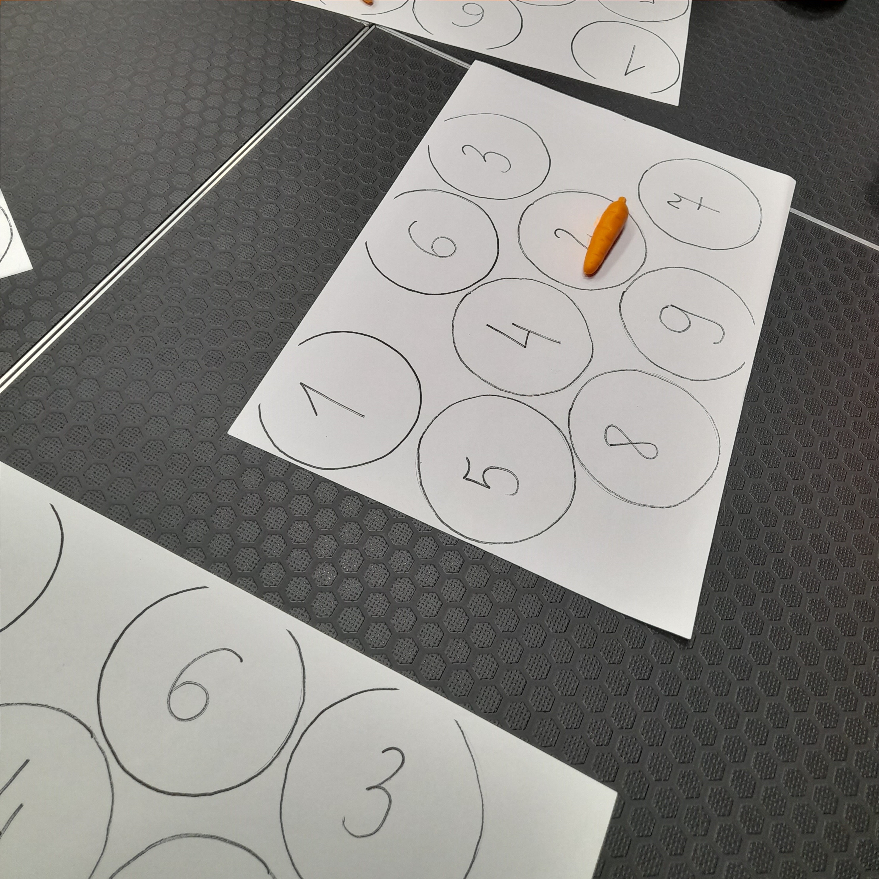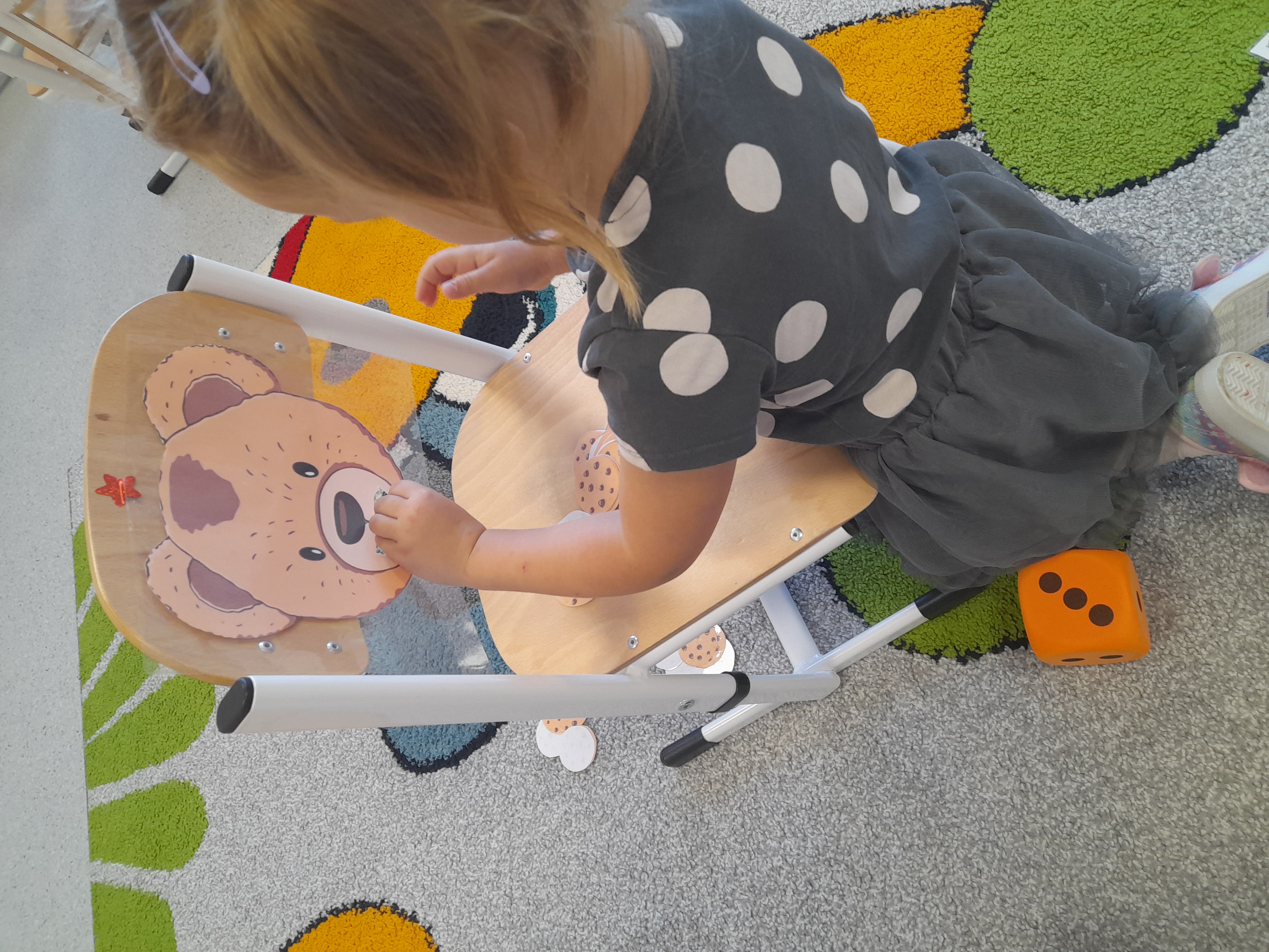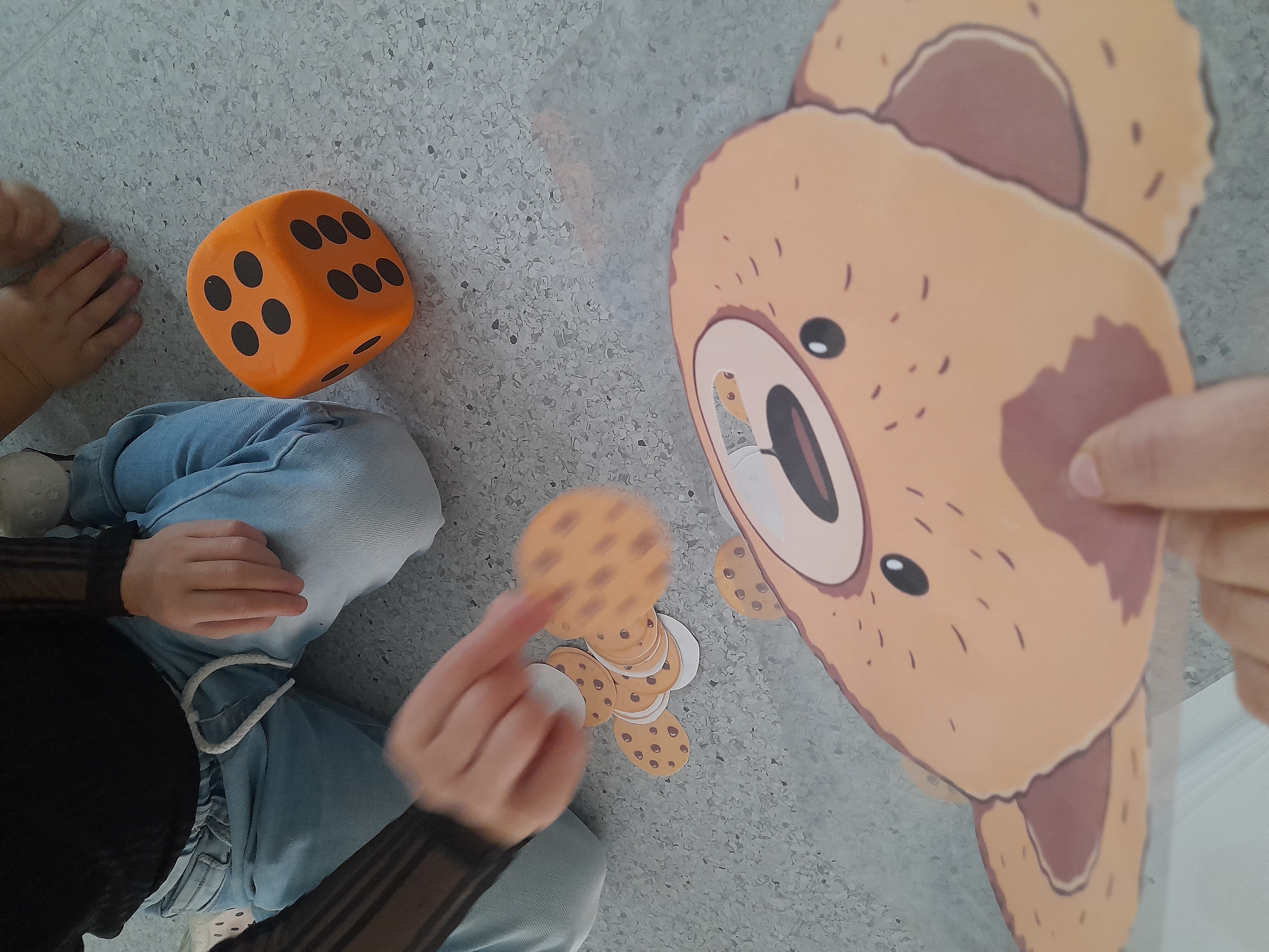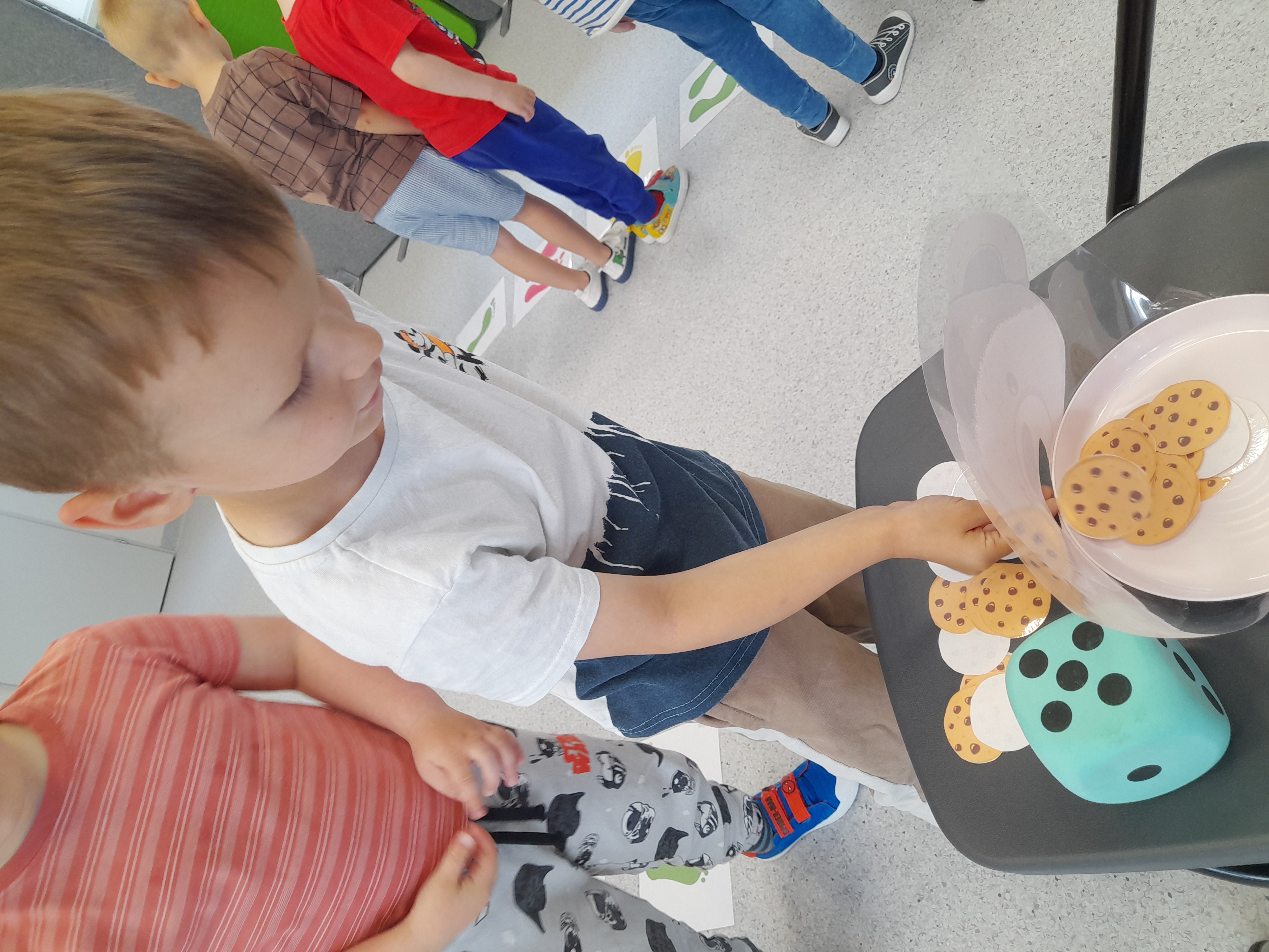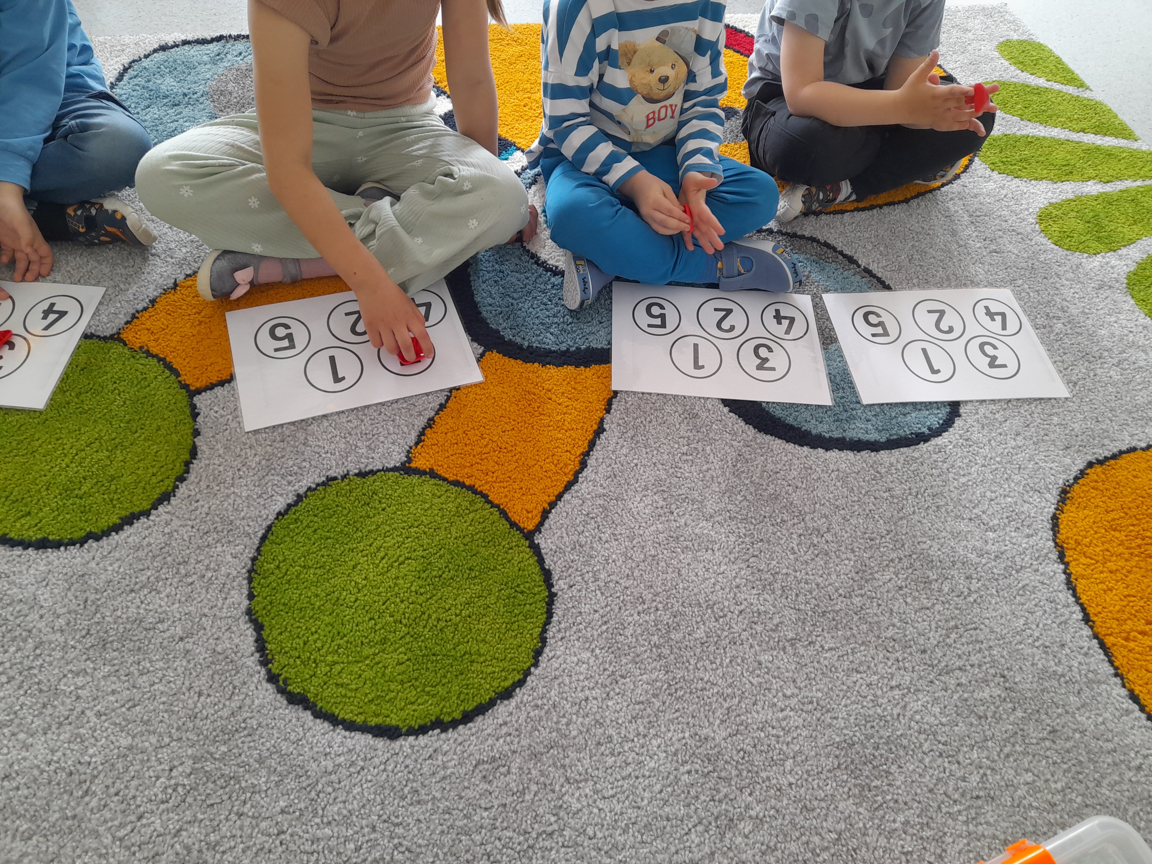 Każdy z graczy miał przed sobą wesołe buźki z różnymi cyferkami. Zadaniem przedszkolaków było obcinanie jednej cyferki nożyczkami, która została wylosowana przez kostkę do gry. Osoba, która obcięła nożyczkami wszystkie cyferki wygrała.