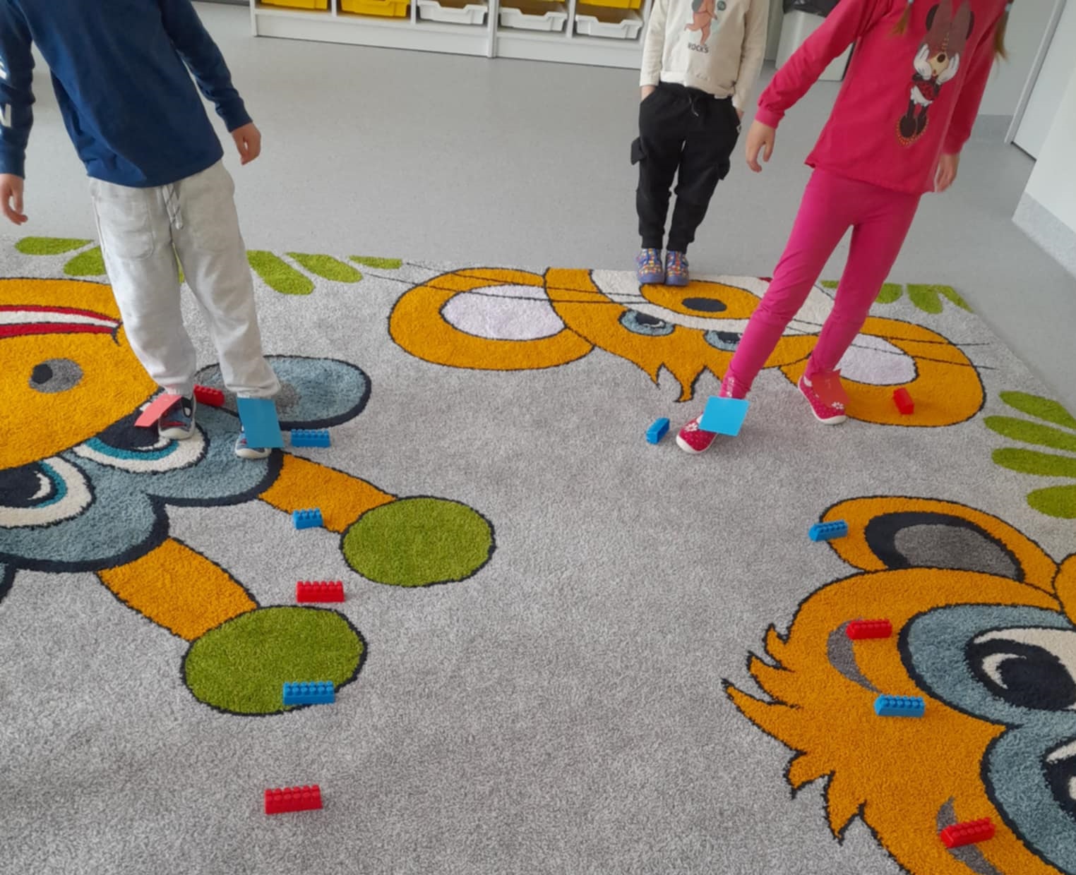 Zadaniem przedszkolaków w tym ćwiczeniu było dopasowanie odpowiednich klocków na daną figurę geometryczną.