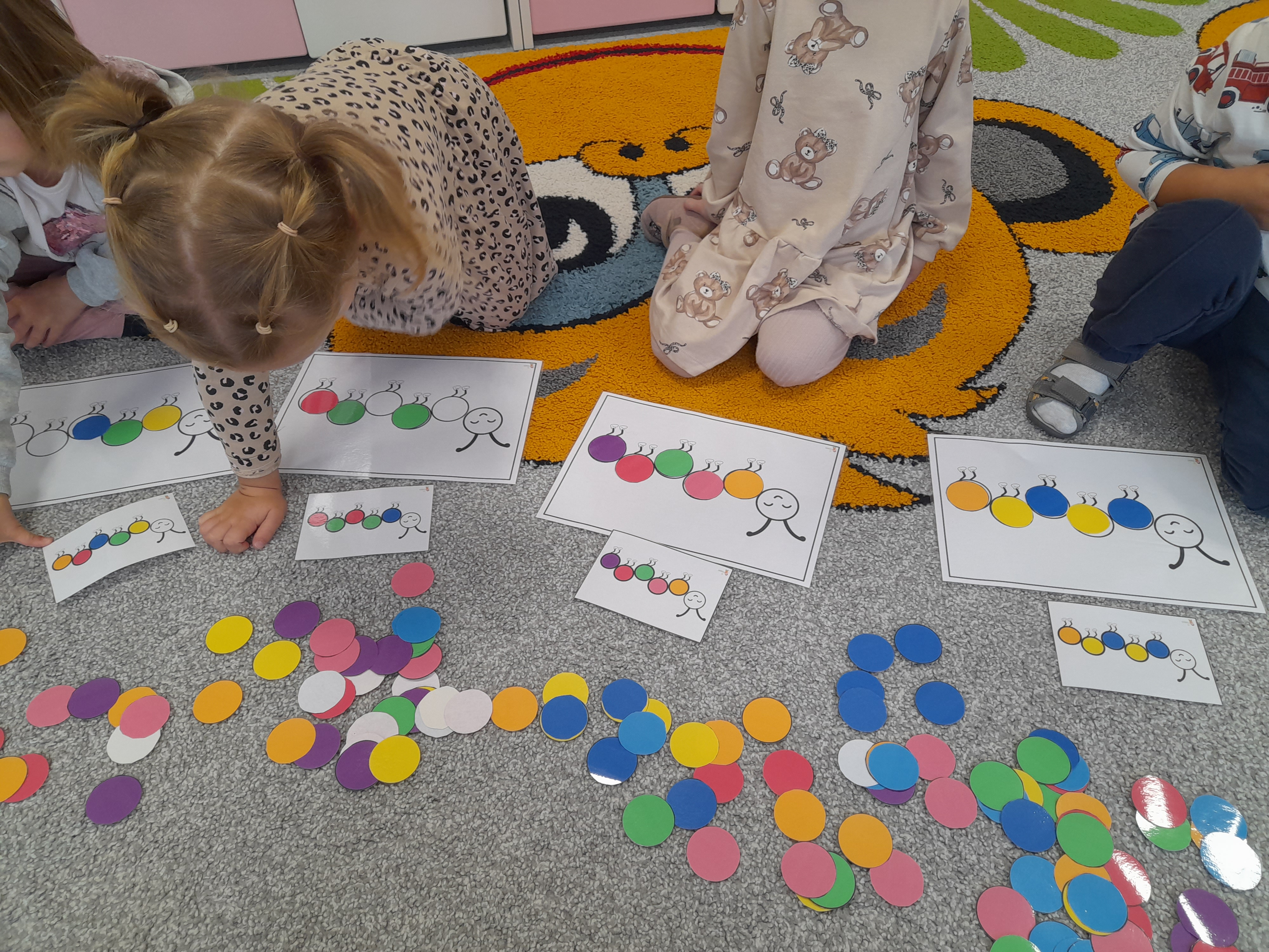 7 listopada nasze 3-latki miały słodkie zadanie :) W sali na dywanie czekały na nich drewniane cukierki. Ich zadaniem było odnaleźć cukierek wg koloru wyrzuconego na kostce. Nazywaliśmy wspólnie kolory, które widzimy. Pojawił sie też u nas, dobrze nam znany piesek, który też zjadł kilka cukierków. Głośno liczyliśmy ile cukierków zjadł nasz piesek.