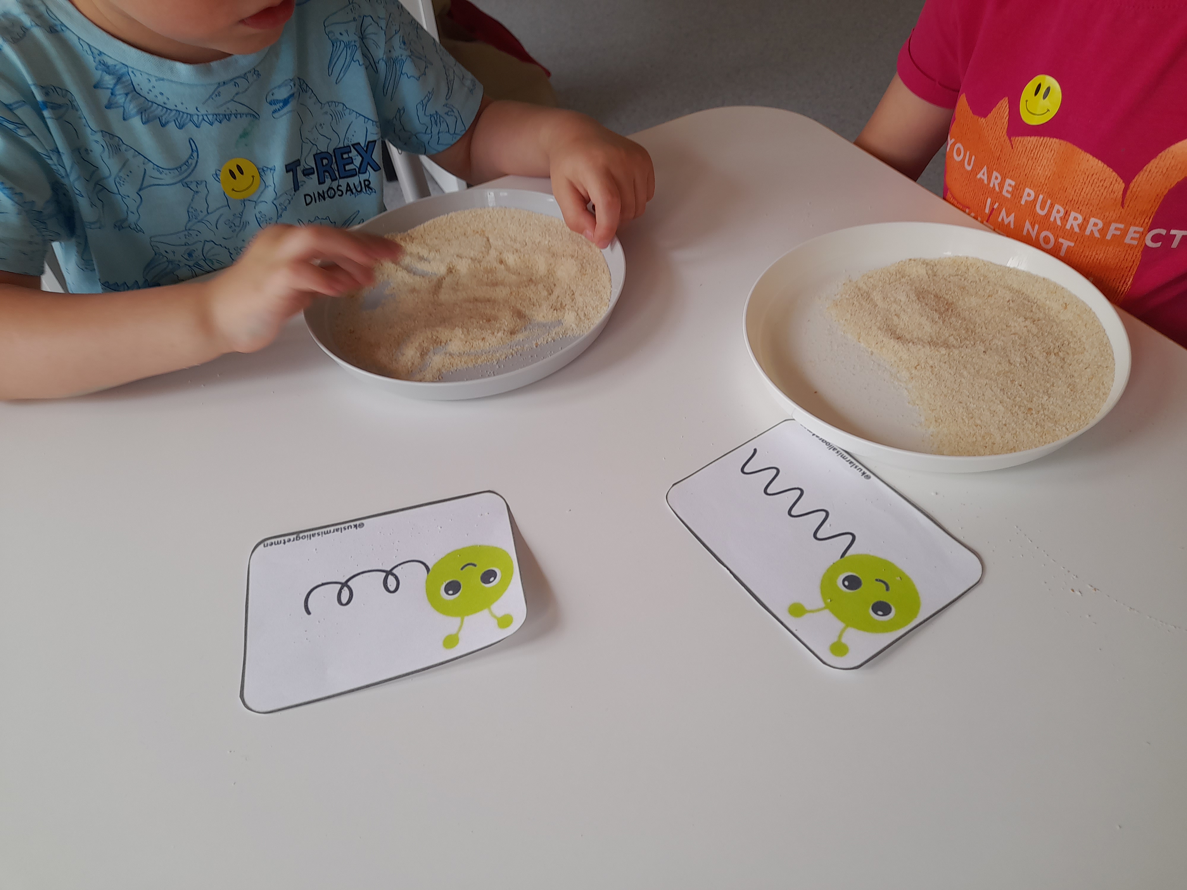 Zabawa ta polegała na przeniesieniu przez słomkę tyle myszek do miseczki ile wskazywała cyfra na stoliku. Podczas wykonywania tego typu zajęć przedszkolaki ćwiczyli nie tylko matematykę ale również ćwiczenia aparatu artykulacyjnego z wykorzystaniem słomki.
