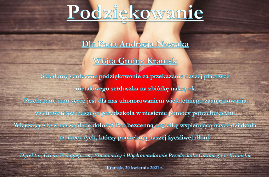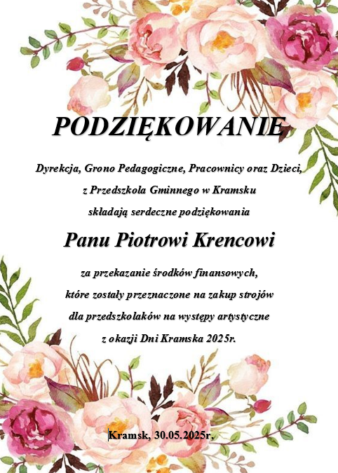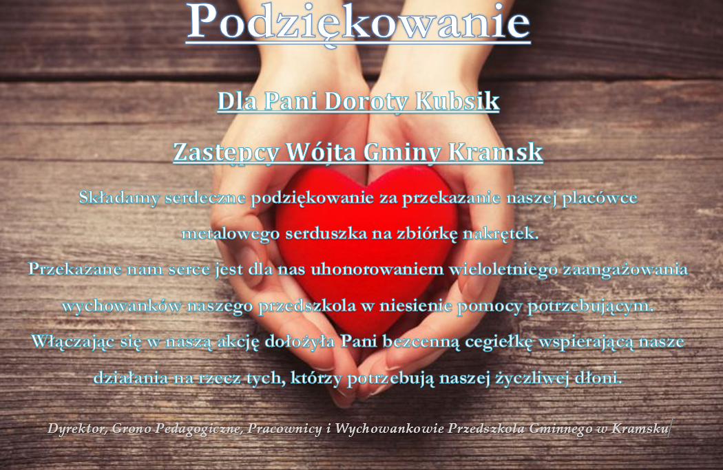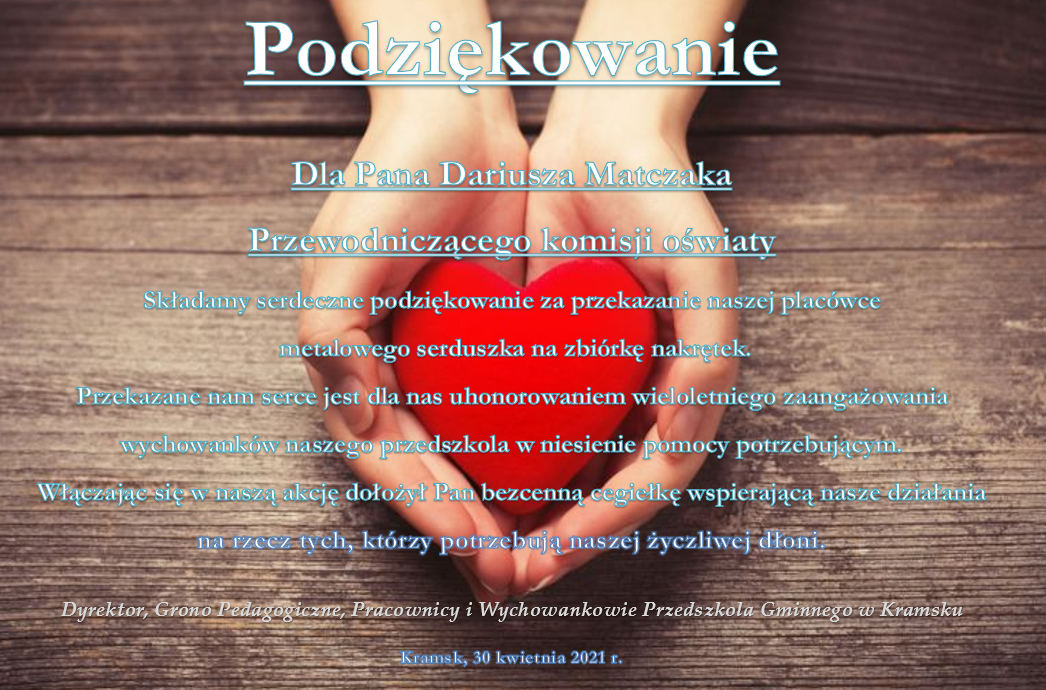 bezinteresownie zapewnił transport w celu przewiezienia żwiru do przedszkoli w Kramsku i Patrzykowie