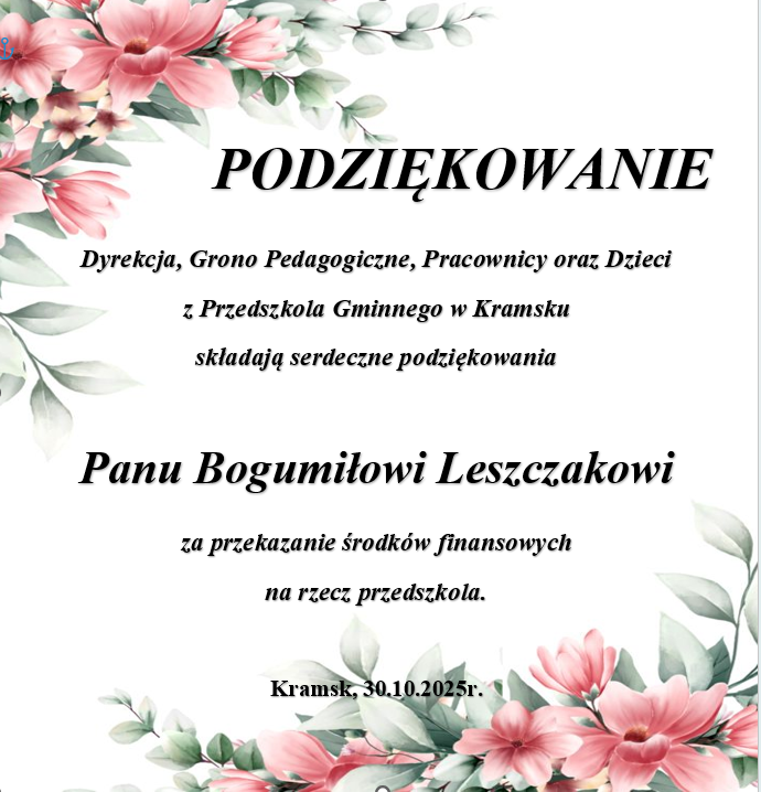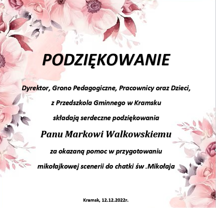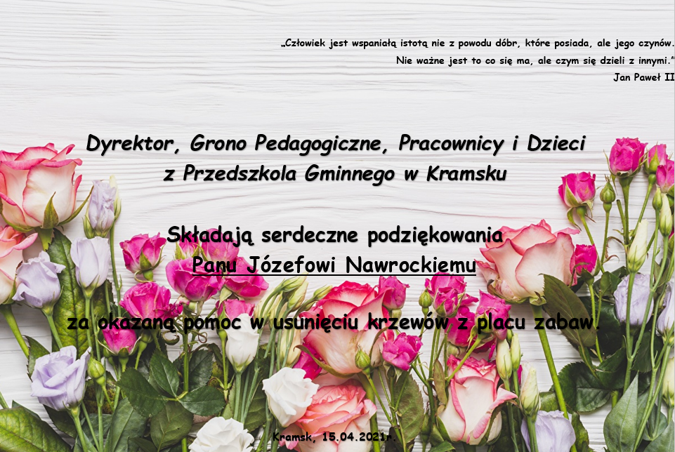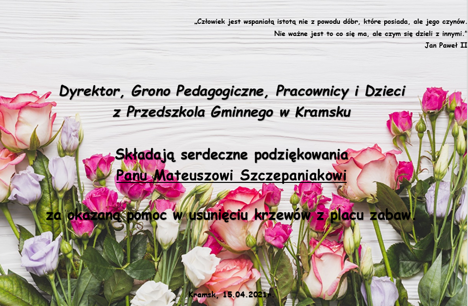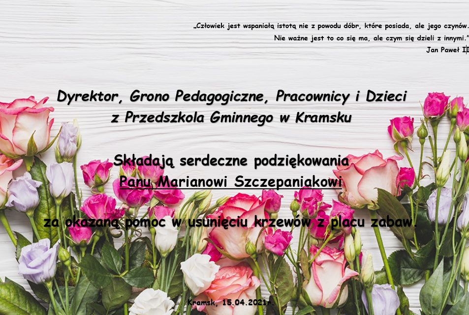 bezinteresownie wspiera nas materialnie, aktywnie włącza się w organizację imprez i uroczystości przedszkolnych, z własnej inicjatywy wykonuje drobne prace remontowe w przedszkolu i na jego terenie