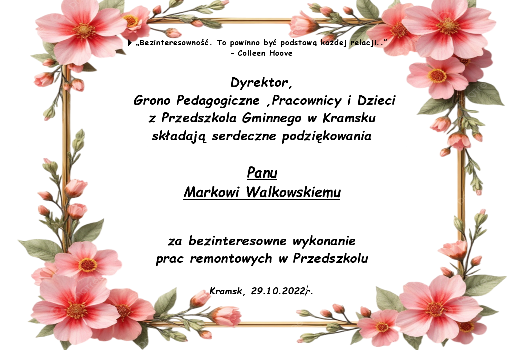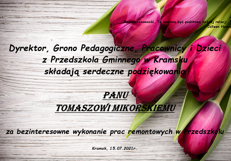 zupełnie bezinteresownie wykonał drobne prace remontowe na terenie przedszkola