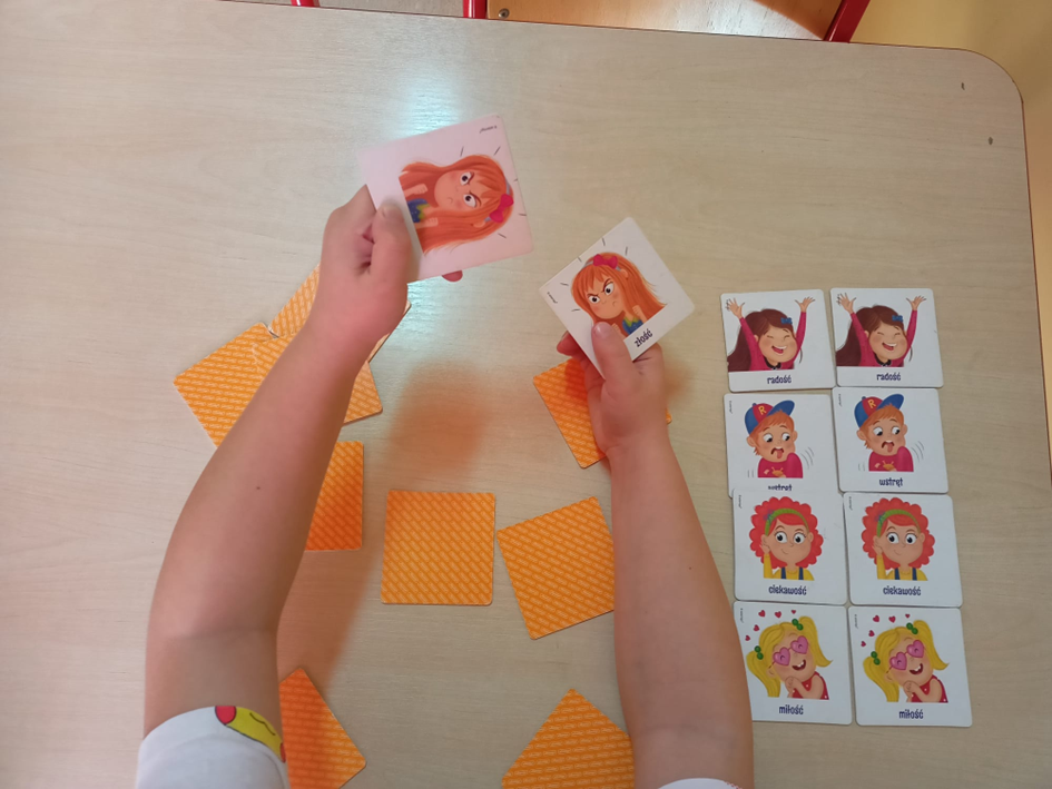 W czasie zajęć kształtujących umiejętności emocjonalno-społeczne wykorzystujemy grę „ Ekspresje”, która obejmuje sposób, w jaki jednostki przekazują swoje emocje za pomocą komunikacji werbalnej oraz niewerbalnych sygnałów. Do tych sygnałów należą mimika twarzy, mowa ciała i gesty fizyczne, takie jak marszczenie brwi czy uśmiech. Dzieci układając twarze wyrażające różne emocje uczą się identyfikacji różnych rysów twarzy, umiejętności obserwacji i kojarzenia oraz akceptacji norm i reguł socjalizacji.