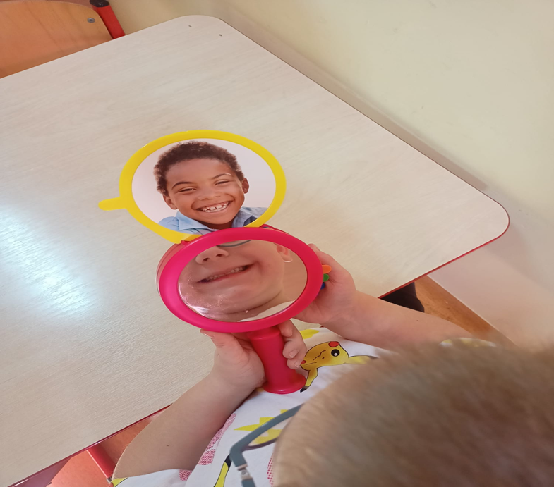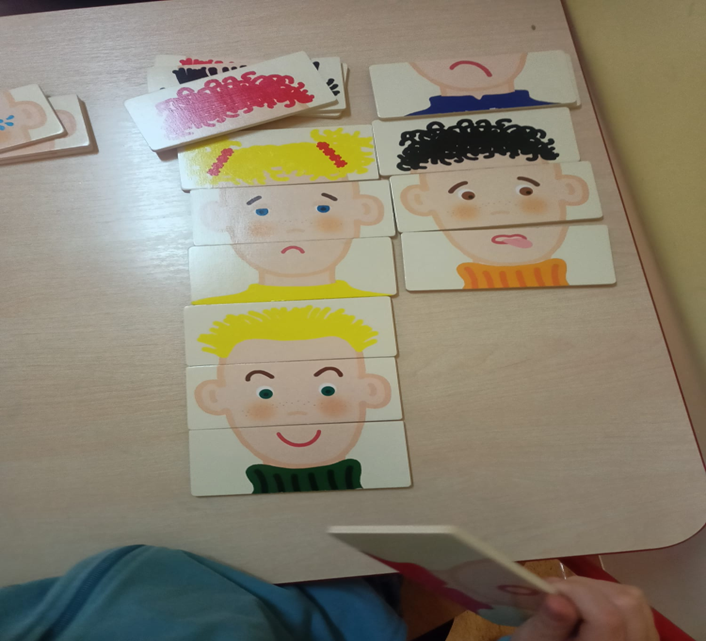 W czasie zajęć kształtujących umiejętności emocjonalno-społeczne wykorzystujemy grę „ Ekspresje”, która obejmuje sposób, w jaki jednostki przekazują swoje emocje za pomocą komunikacji werbalnej oraz niewerbalnych sygnałów. Do tych sygnałów należą mimika twarzy, mowa ciała i gesty fizyczne, takie jak marszczenie brwi czy uśmiech. Dzieci układając twarze wyrażające różne emocje uczą się identyfikacji różnych rysów twarzy, umiejętności obserwacji i kojarzenia oraz akceptacji norm i reguł socjalizacji.